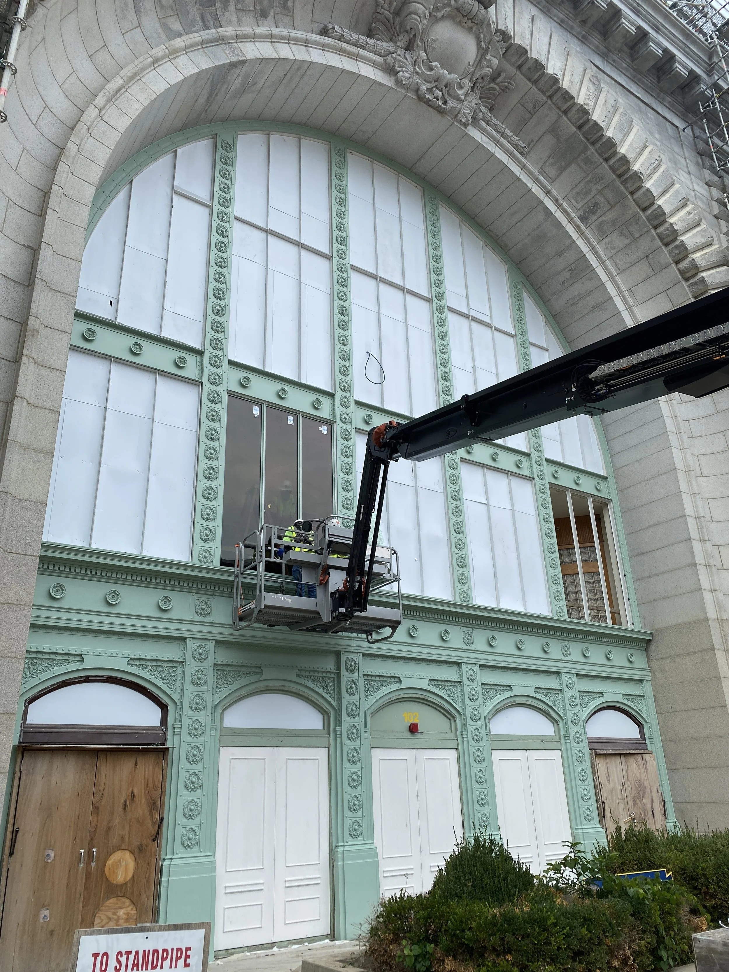 When Apple eyed the building in 2016, it was worn, dirty, and unmodernized. The original Carnegie Libraries were of varying build quality. We reproduced the main entrances, façade, and clerestory casements throughout. We did a mock-up to show Apple these 110-year-old windows could be made to operate from a cell phone, but they were not interested. They chose to install double-pane glass throughout. This will work well in the reproduction sash, but I predict seal failure will develop in the large original sash.