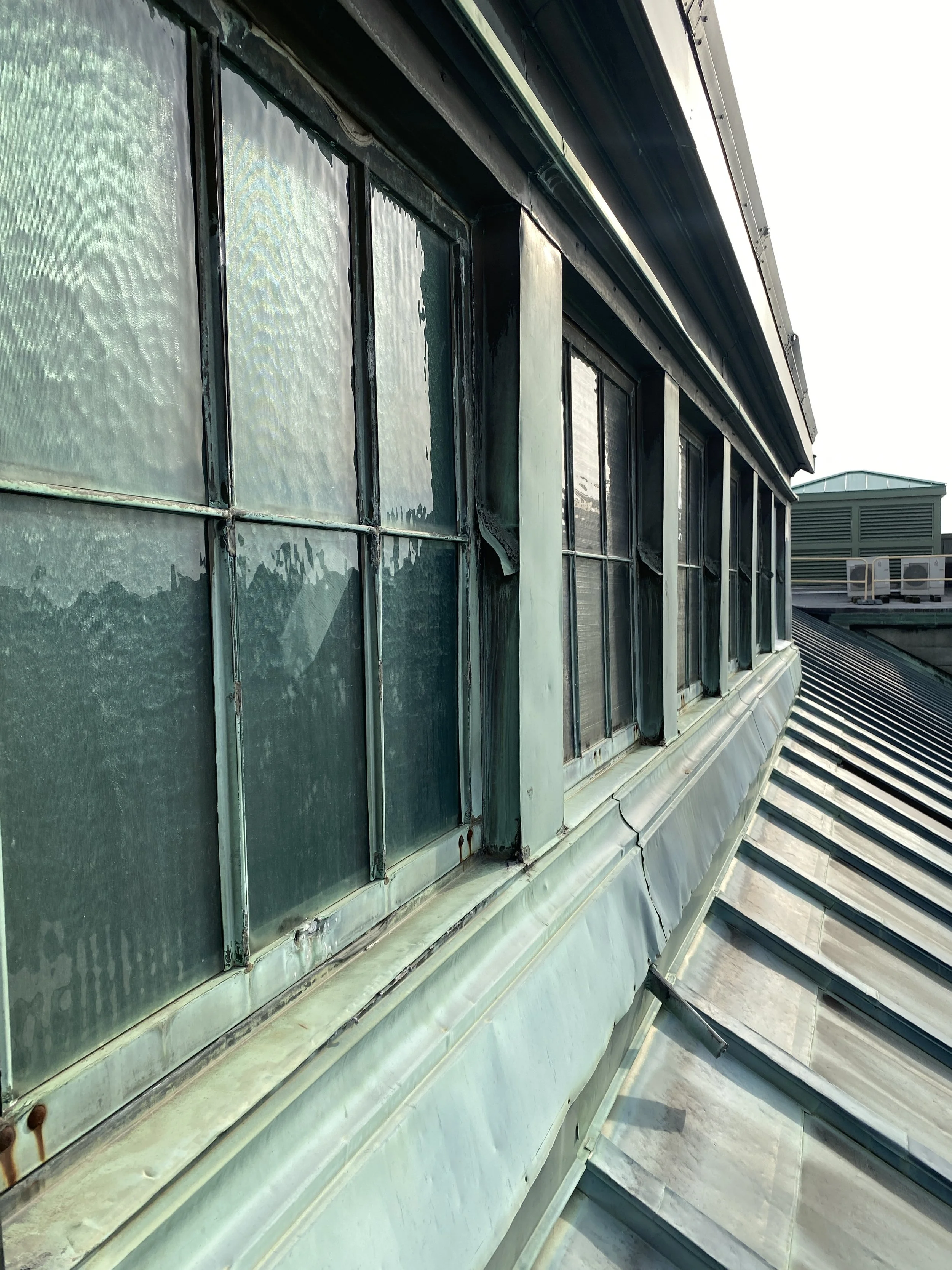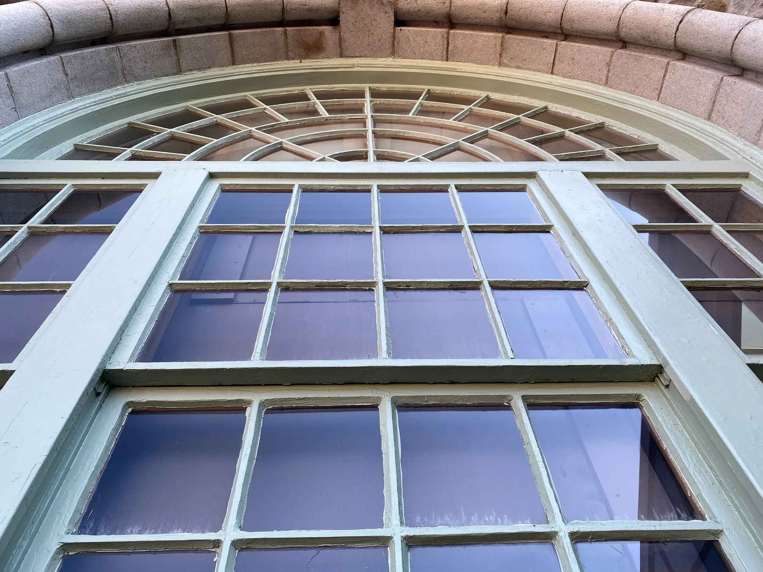 We had complete access to the exterior and right up the tower, so it got maintenance for the first time in 130 years. The original glass was streaked and stained, so we cut all new 1/4” plate glass to replace it all. Rare for our work, the sash were fixed in position.
