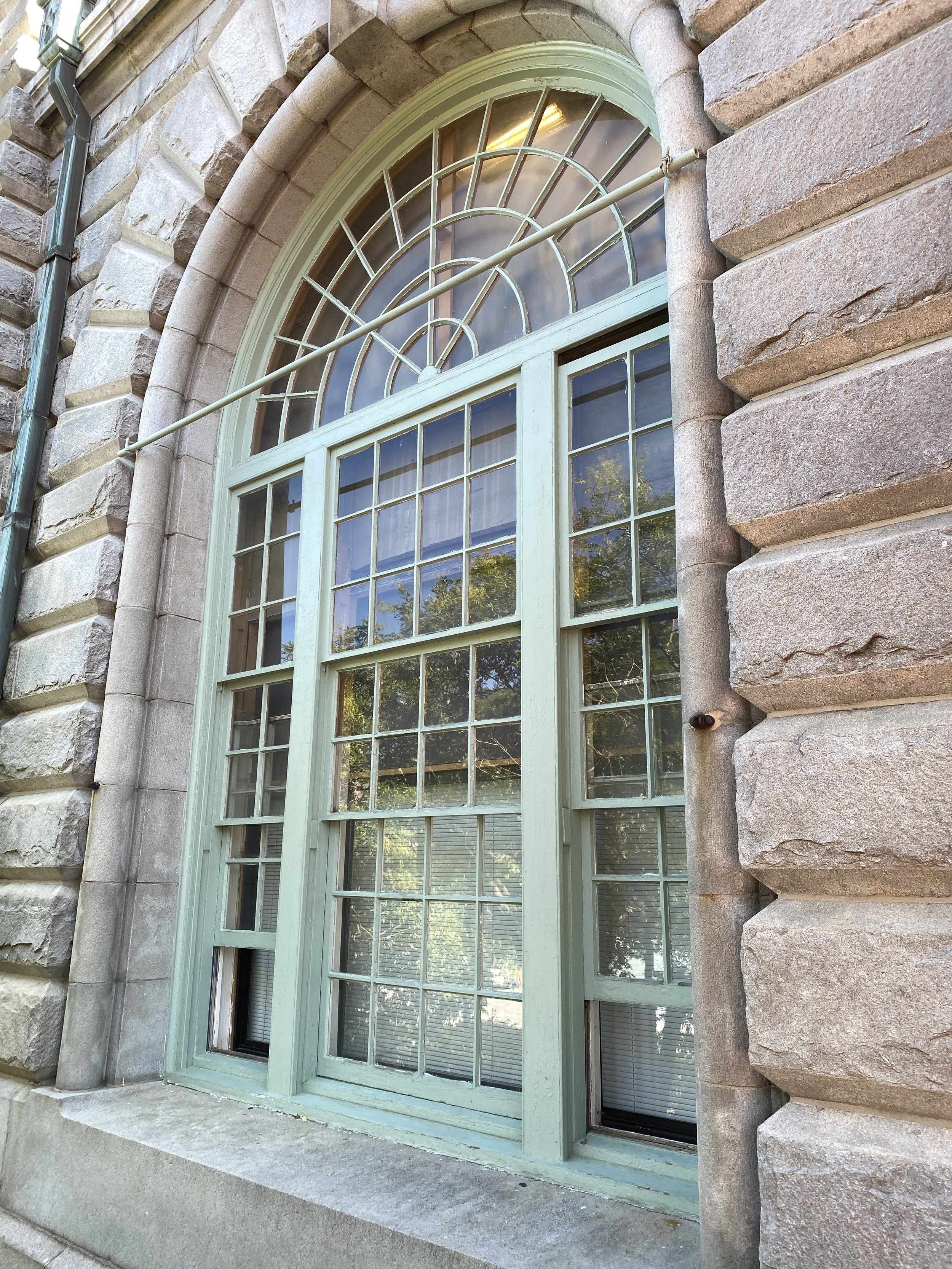 This building is proof of the amazing power of the original growth northeastern white pine, a soft wood which cuts beautifully both by hand and machine and is nearly totally resistant to bacterial decay. The degradation of the windows at JAC is among the most profound we have restored. In its 120 years I don’t think it was ever repainted. The glass was falling to the ground below. Our restoration put another century on these excellent windows. While decay this advanced requires complete sash disassembly, reproduction parts and re-glueing, at least there is less paint stripping. We conserved all the lovely old glass and retrofit our zinc weather stripping so the windows became more efficient than ever.